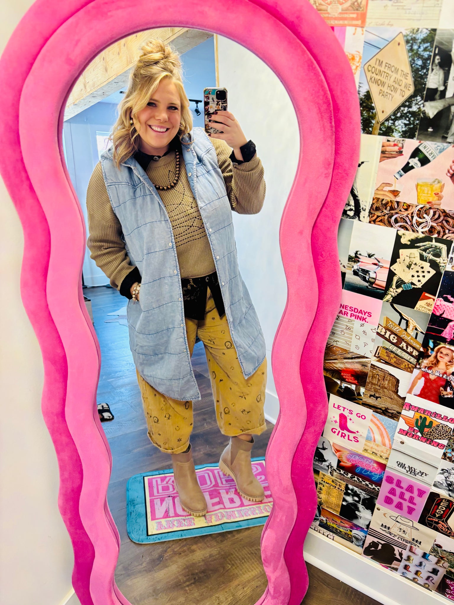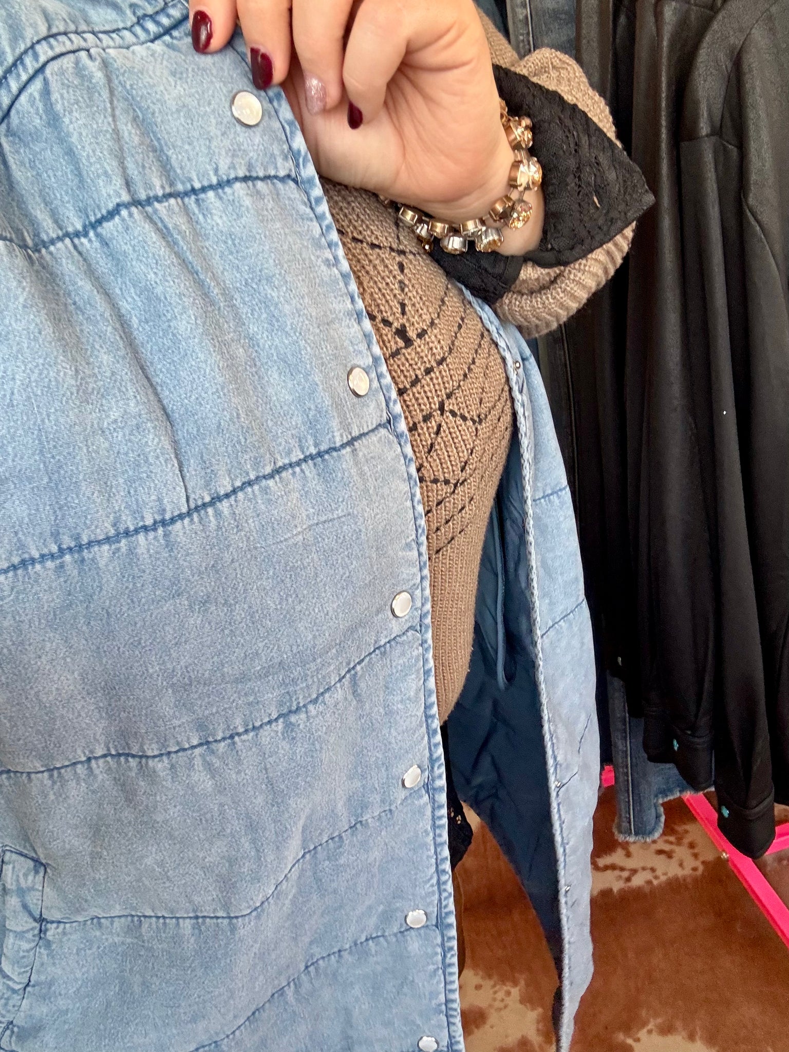This gorgeous denim inspired quilted vest is puffy, soft and TRENDY! & she has pocketttsssss!